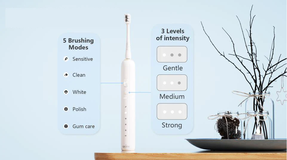 Szczoteczka posiada 5 trybów szczotkowania: delikatne mycie, standardowe mycie, wybielanie, polerowanie oraz pielęgnacja dziąseł. Dodatkowo każdy z tych trybów posiada 3 poziomy intensywności delikatny, średni oraz mocny.