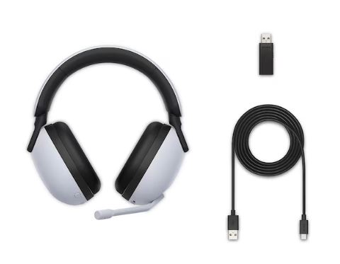 W opakowaniu ze słuchawkami INZONE H7 znajdziesz przewód USB-C do ładowania (1,5 m) i nadajnik-odbiornik USB.