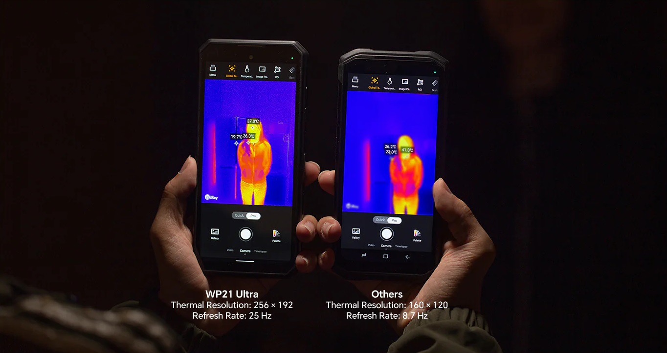 Wytrzymały smartfon Oukitel WP21 Ultra jest wyposażony w bardzo czułą kamerę termowizyjną 256x192, 12 µm InfiRay z częstotliwością odświeżania 25 Hz. Pomiary temperatury są bardzo dokładne a filmy ostre i wyraźne nawet w całkowitej ciemności i niesprzyjających warunkach pogodowych.