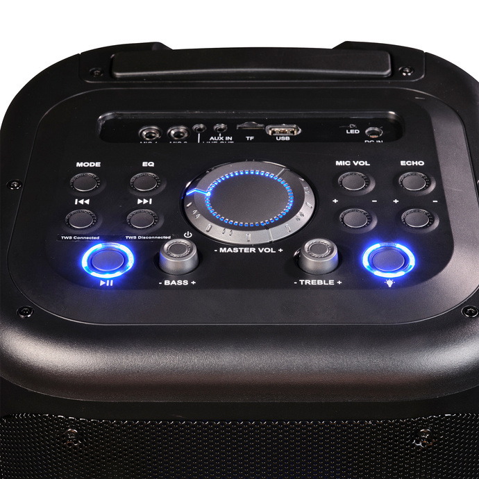 Głośnik wyposażony jest w wbudowany akumulator litowy o pojemności 3600 mAh, który zapewnia do 2 godzin odtwarzania przy 50% głośności, a jego pełne naładowanie zajmuje około 4 godzin. Dzięki wbudowanemu uchwytowi w formie walizki (trolley handle), głośnik jest łatwy do przenoszenia i idealny na plenerowe imprezy i pikniki.