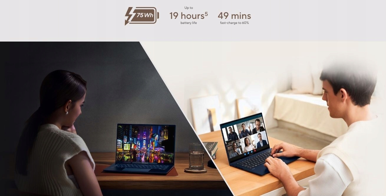 Nie ma powodu do paniki, gdy zabraknie prądu w gniazdkach. Trwała bateria 75 Wh Zenbooka 14 OLED zapewni Ci produktywność. A kiedy nadejdzie czas ładowania, nie musisz zwalniać — w zaledwie 49 minut możesz naładować go do poziomu 60%.