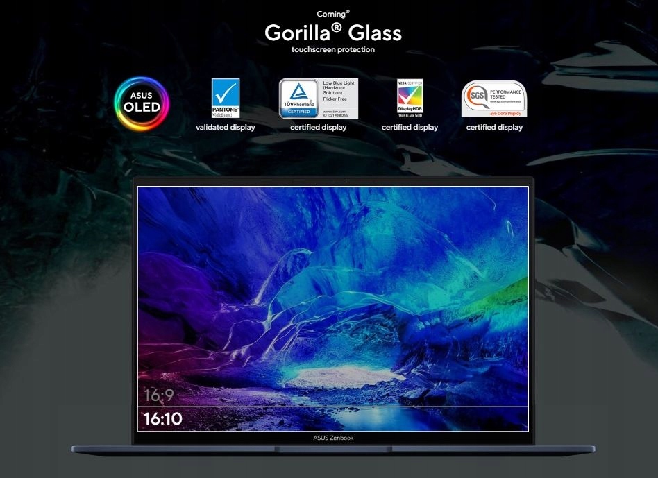 Rozległy ekran dotykowy OLED NanoEdge 16:10 2,8K w Zenbooku 14 OLED zapewnia niewiarygodnie szczegółowy obraz w ultrażywych kolorach. Konstrukcja NanoEdge ma ultracienkie ramki i stosunek ekranu do obudowy wynoszący 90%, co z kolei nadaje Zenbookowi 14 OLED smukłą i kompaktową obudowę. Aby zapewnić doskonałą dokładność kolorów, wyświetlacz posiada certyfikat PANTONE®, a certyfikat DisplayHDR™ True Black 500 oznacza, że wyświetla najgłębszą możliwą czerń. Dba także o Twoje oczy podczas długich sesji przed ekranem, przy niskim poziomie niebieskiego światła, co zostało potwierdzone certyfikatami SGS i TÜV Rheinland.