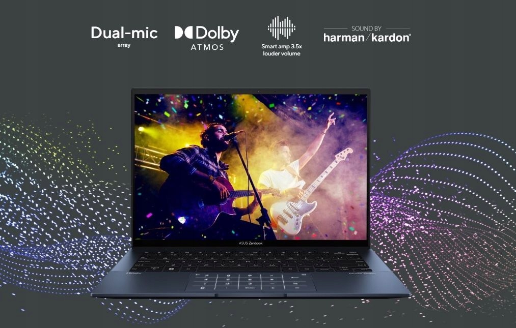 Aby zapewnić doskonałą jakość dźwięku, Zenbook 14 OLED jest wyposażony w system dźwięku stereo Dolby Atmos certyfikowany przez ekspertów ds. dźwięku z firmy Harman Kardon. Zapewnia mocny, wciągający i krystalicznie czysty dźwięk z wielowymiarowym krajobrazem dźwiękowym Dolby Atmos. Zanurzy Cię w ulubionej rozrywce dzięki dźwiękowi, który porusza się wokół Ciebie z zapierającym dech w piersiach realizmem w muzyce, filmach i telewizji.