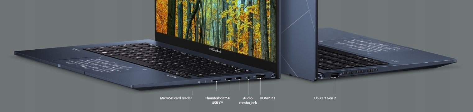 Zenbook 14 OLED jest wyposażony we wszystkie porty I/O potrzebne do łatwej łączności z urządzeniami i urządzeniami peryferyjnymi. Najnowsze ultraszybkie porty Thunderbolt™ 4 USB-C® obsługują szybkie ładowanie, zewnętrzne wyświetlacze 4K UHD i przesyłanie danych z szybkością do 40 Gb/s9, a także port HDMI® i port USB 3.2 Gen 2 Type-A oraz czytnik kart microSD. Za komunikację i wejścia/wyjścia audio odpowiada wygodne gniazdo combo audio.
