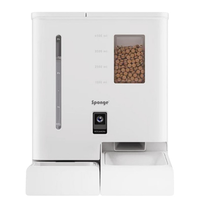 Inteligentny dozownik karmy Sponge Pet Feeder Dual to nowoczesne urządzenie, które łączy funkcję karmienia i pojenia zwierząt w jednej kompaktowej konstrukcji. Dzięki pojemnikom o pojemności 5 litrów na karmę i 4 litry na wodę, zapewnia komfort opieki nad pupilem nawet podczas dłuższej nieobecności właściciela. Sterowanie odbywa się zdalnie przez aplikację mobilną, a wbudowana kamera HD umożliwia podgląd w czasie rzeczywistym. Urządzenie oferuje również funkcję nagrania głosu właściciela, który zostanie odtworzony przed posiłkiem. Zasilanie sieciowe z opcją awaryjnego zasilania bateryjnego zapewnia ciągłość pracy.