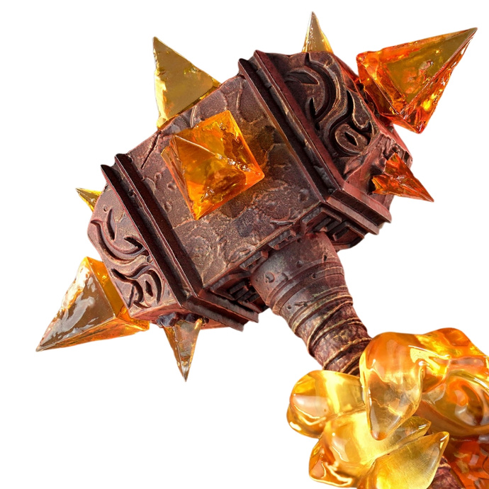 Ragnaros, zanurzony w buchającej lawie, unosi się w gniewnej pozie, dzierżąc swoją ikoniczną broń – Sulfuras, Rękę Ragnarosa. Każdy element jego sylwetki został misternie wyrzeźbiony – od potężnych ramion, przez pęknięcia w skórze przypominającej rozżarzoną skałę, aż po ciemną zbroję pełną dramatycznych detali. Wzbijający się za nim smok z dymu nawiązuje bezpośrednio do ilustracji znanej z kart Hearthstone, dodając figurce dynamicznego, niemal filmowego charakteru.