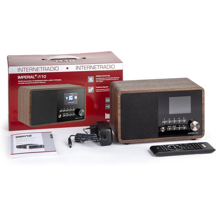 Radio Imperial i110 Wi-Fi zapewnia pełną wygodę obsługi dzięki dołączonemu pilotowi oraz aplikacji mobilnej AirMusic Control. Pilot umożliwia szybkie przełączanie stacji, regulację głośności i obsługę odtwarzacza multimedialnego bez potrzeby podchodzenia do urządzenia. Z kolei aplikacja AirMusic Control pozwala na zdalne sterowanie radiem z poziomu smartfona, ułatwiając wybór stacji internetowych, zarządzanie listami odtwarzania i dostosowanie ustawień dźwięku w dowolnym miejscu w domu.