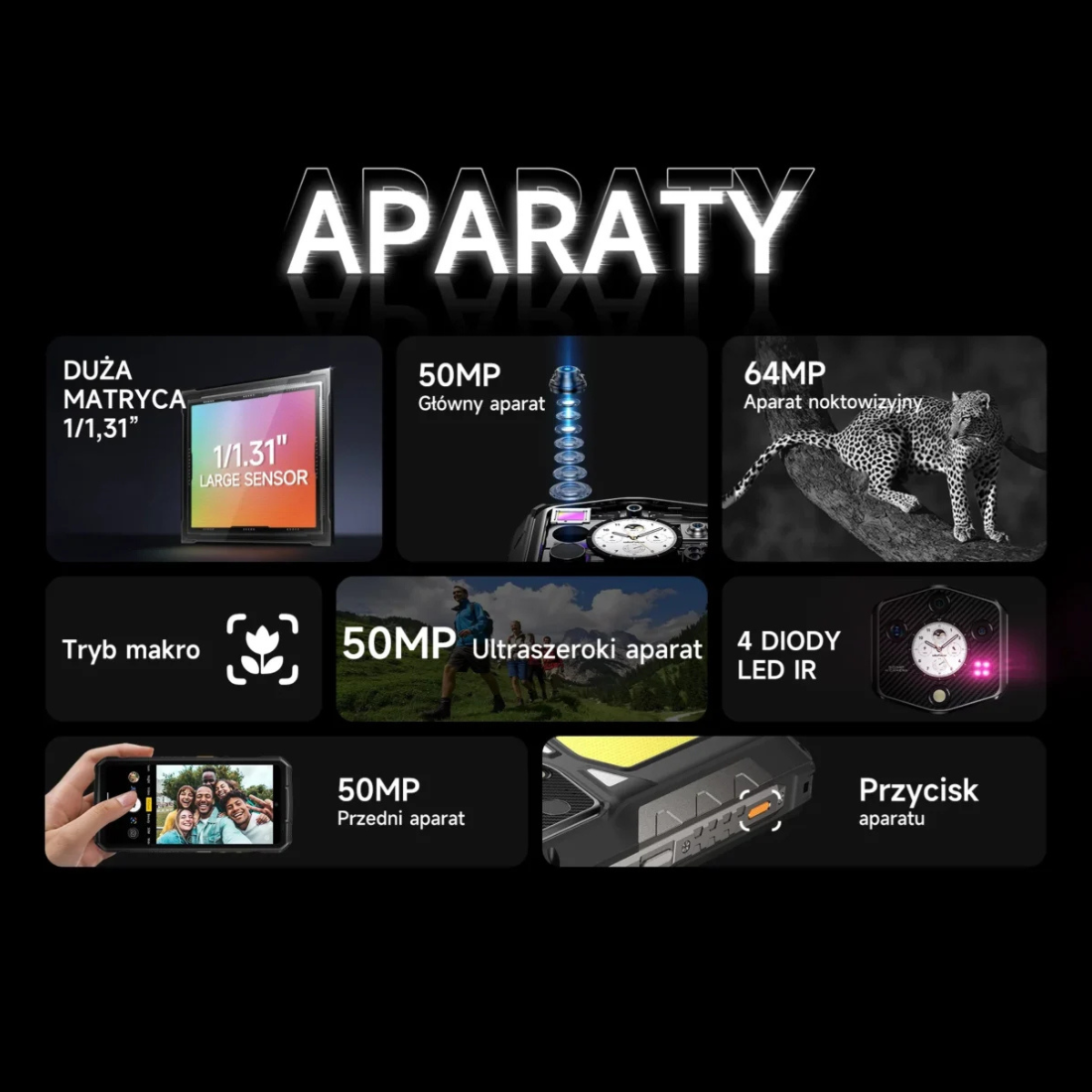 Główny aparat 50 MP oparty na dużej matrycy Samsung ISOCELL GN1 o rozmiarze 1/1,31 cala zapewnia wysoką jakość zdjęć w dzień i po zmroku. Duże piksele oraz jasna przysłona poprawiają efekty fotografowania w słabym świetle, a elektroniczna stabilizacja obrazu pomaga uzyskać wyraźne ujęcia. Uzupełnieniem zestawu jest ultraszerokokątny aparat makro 50 MP z polem widzenia 117,3°, który pozwala uchwycić rozległe krajobrazy i detale z bliska. Aparat noktowizyjny 64 MP z matrycą OMNIVISION OV64B oraz algorytmem NightElf Ultra 3.0 umożliwia rejestrowanie obrazu w całkowitej ciemności. Cztery diody podczerwieni LED zwiększają zasięg i szczegółowość zdjęć nocnych. Z przodu znajduje się aparat selfie 50 MP, który sprawdzi się podczas wideorozmów i nagrań, oferując wysoką rozdzielczość i dobrą szczegółowość obrazu.