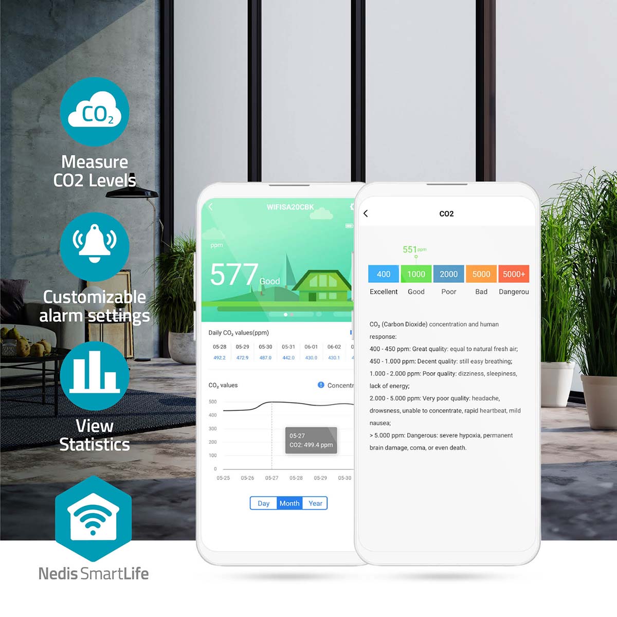 Nedis SmartLife WIFISA20CBK wykorzystuje czujnik NDIR CO₂, który pozwala na stabilny i precyzyjny pomiar stężenia dwutlenku węgla w pomieszczeniu. Urządzenie stale analizuje dane i umożliwia szybką reakcję (np. wietrzenie pomieszczenia), gdy wartości są niekorzystne.