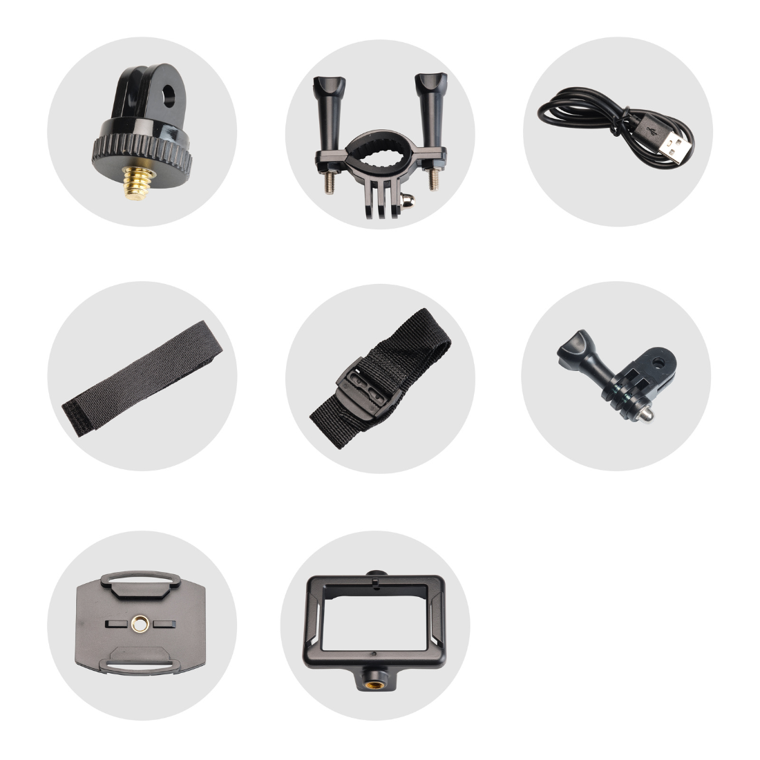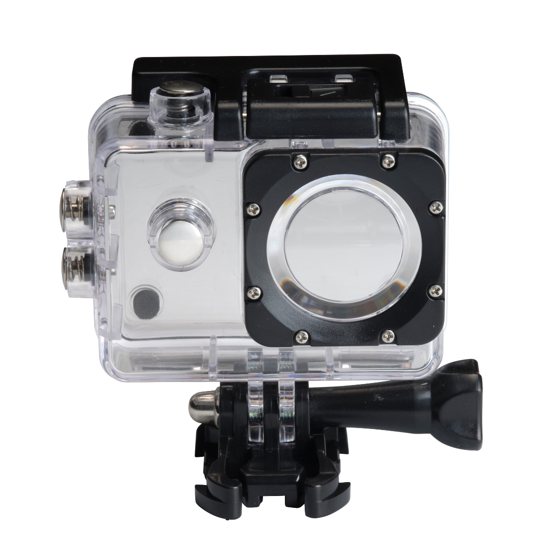 Dołączona w zestawie obudowa ochronna zapewnia wodoodporność do 30 metrów, co pozwala korzystać z kamery podczas aktywności wodnych. W komplecie znajdują się również liczne uchwyty i mocowania, m.in. do roweru i kasku, a także klipsy i elementy montażowe.